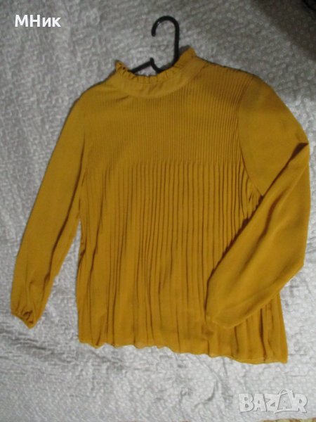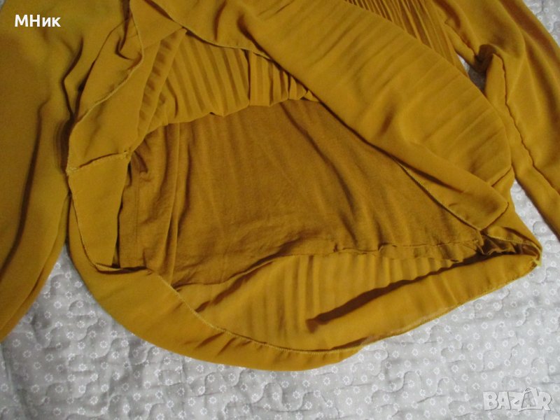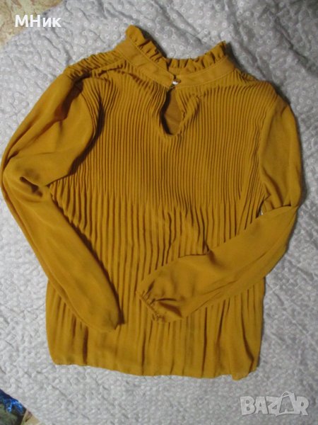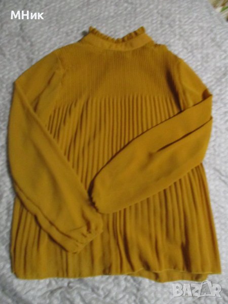 Дамска елегантна блуза, цвят горчица. Къдрички на врата. Закопчава се с копче отзад. Подплата за да не прозира. Рамене 40 см, ширина под мишниците 50 см, дължина 60 см.