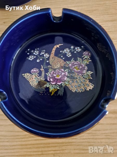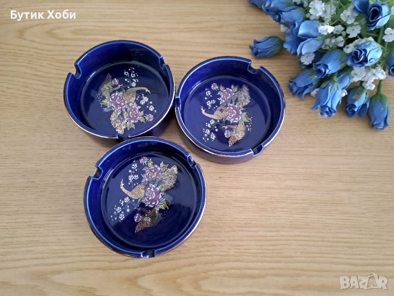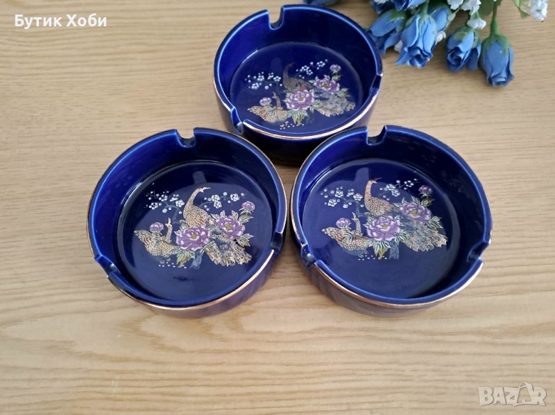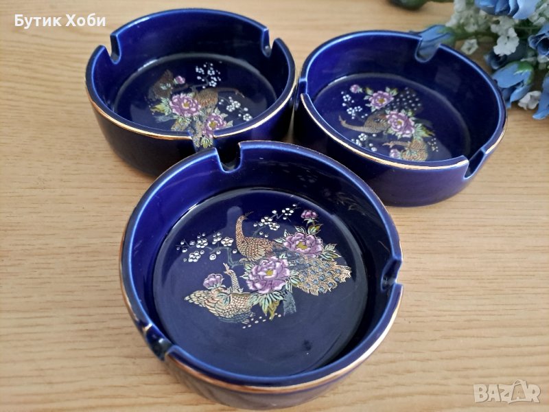 Комплект порцеланови пепелници с мотиви. паун,, типични за далечния Изток. Прекрасна изработка, кобалт, запазено златните декорации.