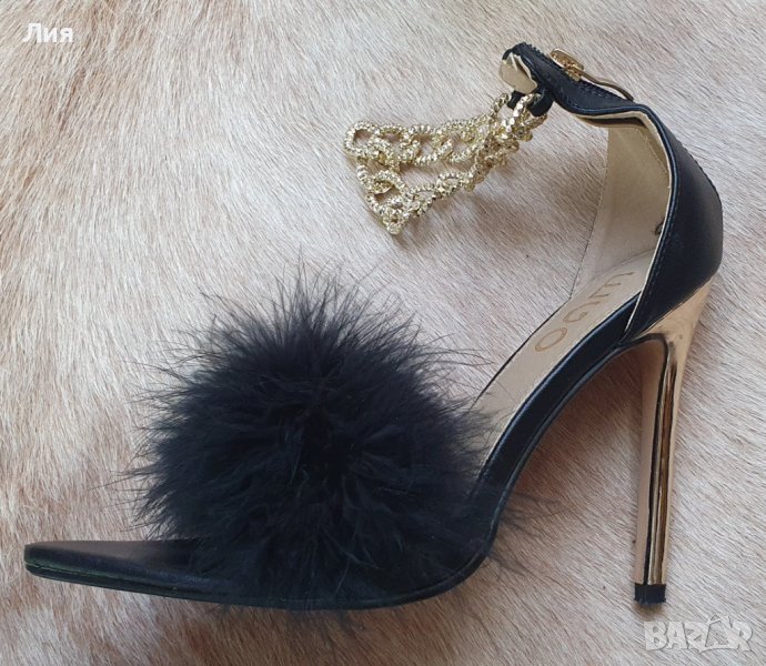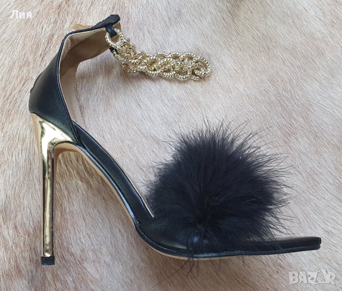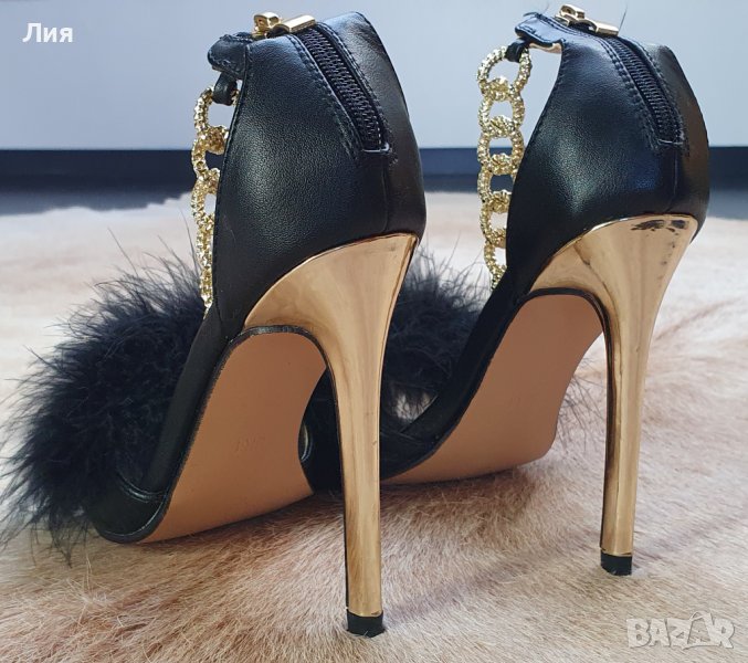 Височина на тока 11,5 см. Естествена кожа. Закопчаване с цип. Детайли в златисто.