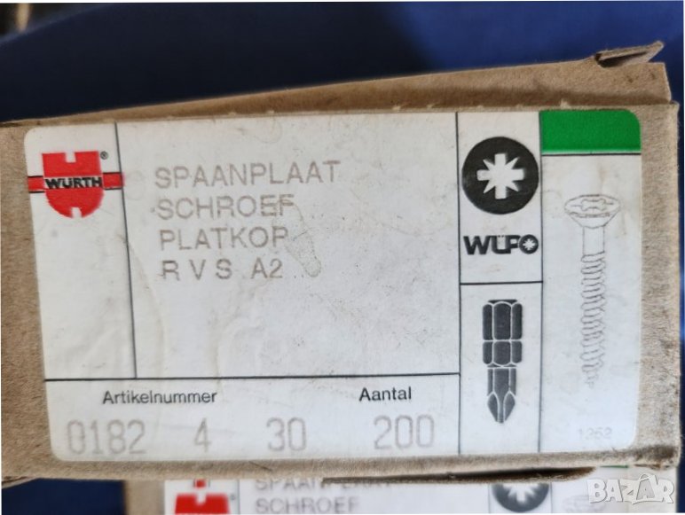 Винтове от неръждаема стомана за дърво, ПДЧ, МДФ - на фирма Вюрт (WURTH) в кутии по 200 бр. С плоска глава.
