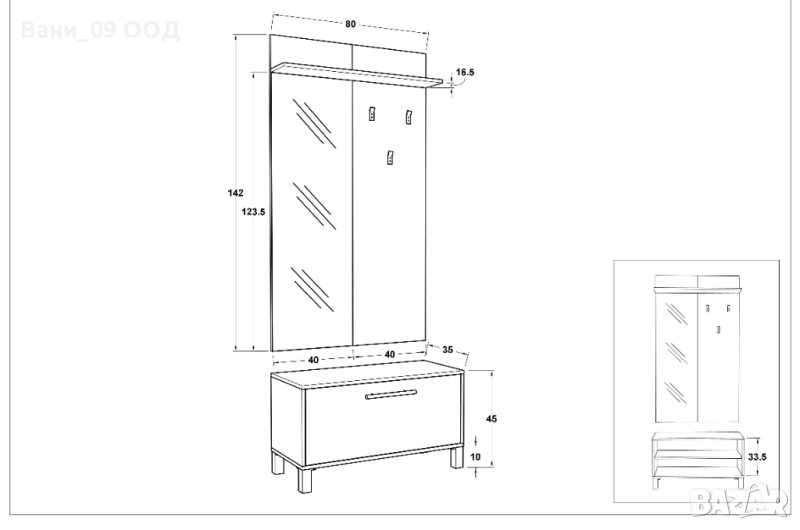 Състои се от закачалка-панел с огледало, както и шкаф за обувки с вратичка и 1 рафт
