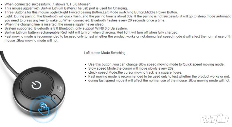 Бутон за захранване: механизмът за движение на мишката ще се включи и ще се премести автоматично. Включено- включено е по подразбиране. Когато го натиснете, той ще се изключи. Когато линията за зареждане чрез USB е поставена, устройството за движение на мишката никога не спи.