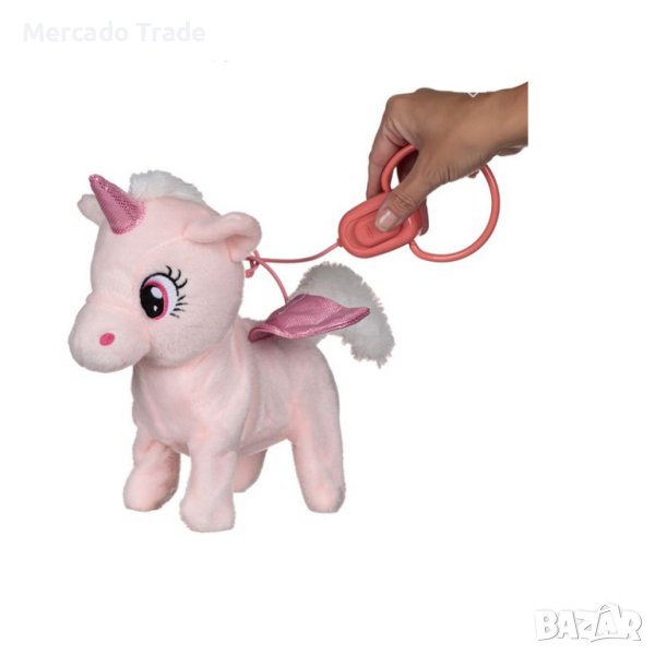 Розов механичен еднорог с каишка 80см с копче, което маха с опашка, свети клаксона и пуска музика.
