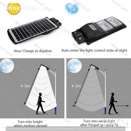 ъгъла на монтиране на соларната лампа. Разстоянието, от което ще засича