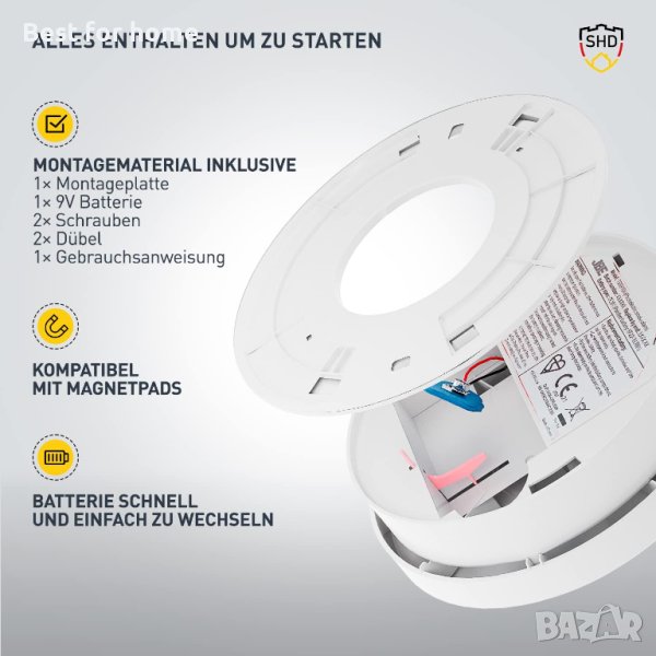 Противопожарните аларми в собствените ви четири стени са не само животоспасяващи, те са задължителни. Детекторът за дим DOF19 от SHD на oneConcept отговаря на всички задължителни изисквания и следователно е добър и достъпен избор за целия ви апартамент, офис сграда или къща. Ангел-пазител дори в съня ви: Благодарение на предупредителния сигнал от 85 dB, детекторът за дим SHD by oneConcept дори ви събужда от съня ви и не може да бъде игнориран в цялата къща. Можете да инсталирате противопожарната аларма само с няколко прости стъпки и да разчитате на нея дълги години напред благодарение на сменяемата батерия. Благодарение на простия си дизайн и малкия си формат, незабележимият спасител се вписва ненатрапчиво във вашето жилищно пространство. Надеждна безопасност във всяка стая: С оптичен сензор, детекторът за дим DOF19 от SHD от oneConcept идентифицира надеждно всяка опасност от пожар и ви предупреждава незабавно!