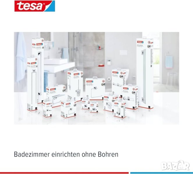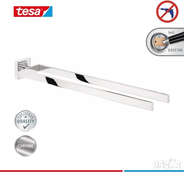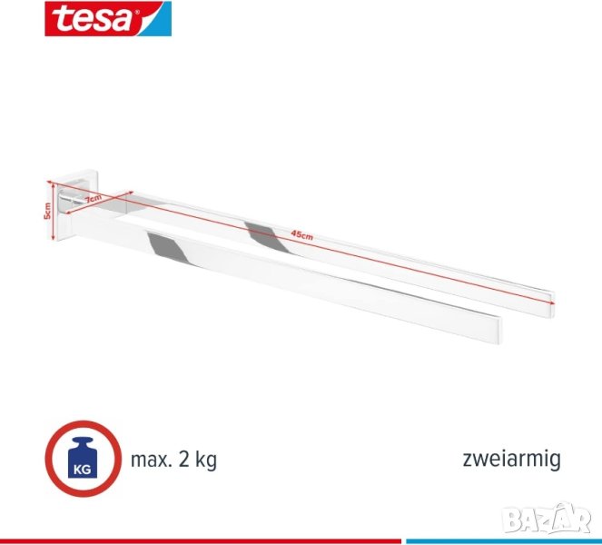 внос от Германия.Закачалка за кърпи за баня Tesa DELUXXE, 2-раменен, хромиран - устойчив на ръжда, за стенен монтаж без пробиване, включително лепилен разтвор - 450 mm x 72 mm x 50 mmВодоустойчив аксесоар за баня със сигурно захващане: издръжлив държач за кърпи с две рамена с изключително здраво лепило за дълготрайно захващане - въртящите се рамена позволяват многократна употребаЕлегантен дизайн за стилни бани: частично ъгловата, частично заоблената форма на държача за хавлии с 2 рамена в комбинация със страхотния външен вид на неръждаема стомана създава модерна атмосфера във всяка баняЛесен монтаж без пробиване: монтиране без усилие и без пробиване на държача за кърпи за ръце без повреждане на стени и плочки благодарение на патентованата технология за закрепване на tesa Power.KitВъзможност за многократна употреба въпреки високата лепилна способност: с монтажен адаптер BK20 металният държач за кърпи може да бъде отстранен и прикрепен отново, без да оставя никакви следи - подходящият адаптер се предлага отделноМоже да се монтира върху много повърхности: залепва към плочки, метал, естествен камък, мрамор, стъкло, дърво и много пластмаси - не е подходящ за мазилка, тапети, текстил за стени и пластмаси като PP, PE и PTFE