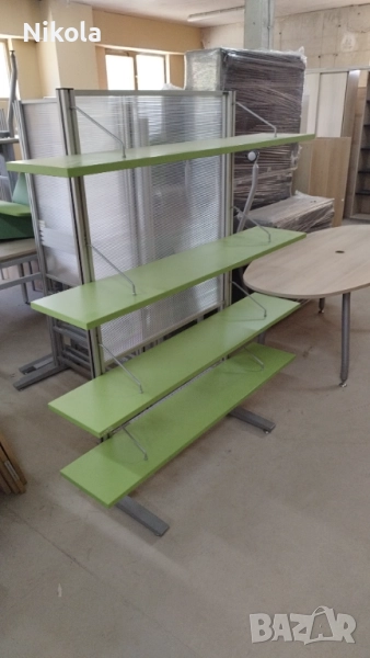 Има двустрани етажерки с 4рафта по два от странас цена 210лв и еднострани 185лв етажерки