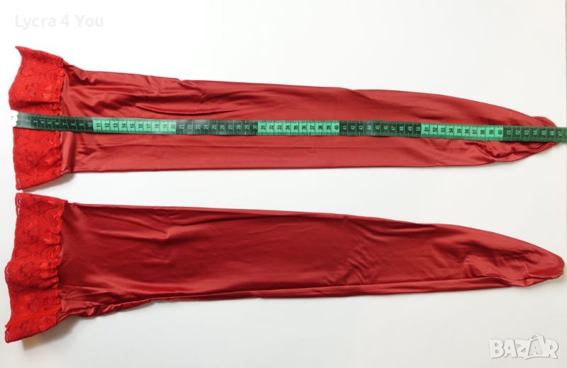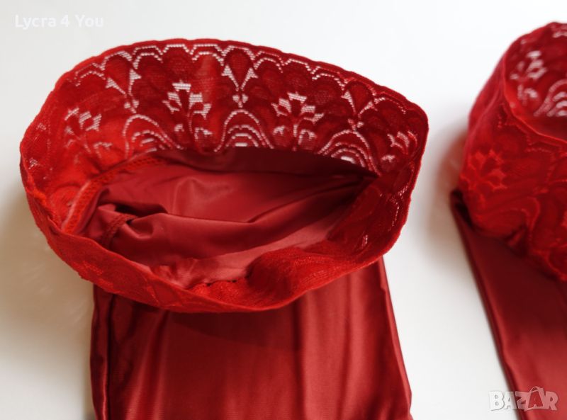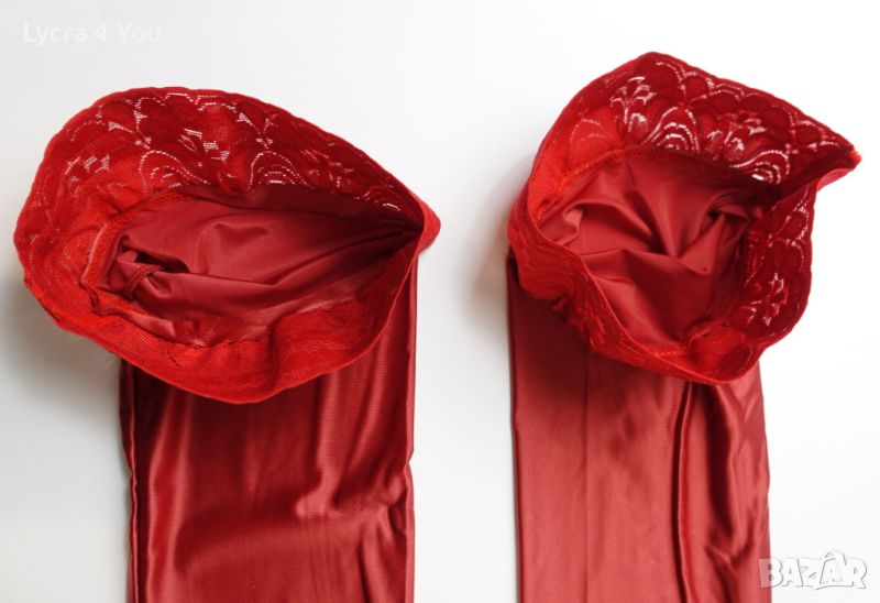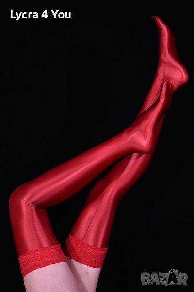 Като нови с опаковка (обличани веднъж), червени ултра лъскави чорапи със силиконова лента и плътност на чорапа 80 Den.