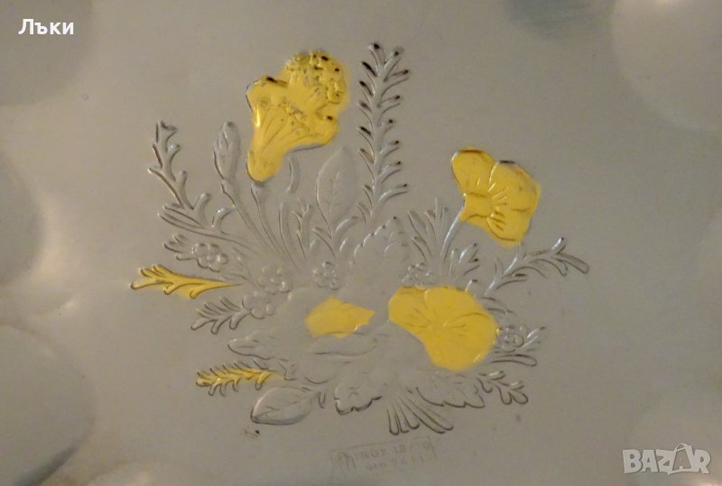 Италиански съд за сервиране,фруктиера,салатиера,изработен от инокс 18/10.Декориран с красив релеф,релефни цветя и 24 карата злато.Маркиран Inox 18/10 Oro 24 Kt.Има две