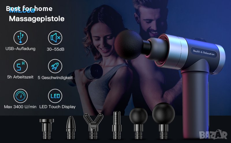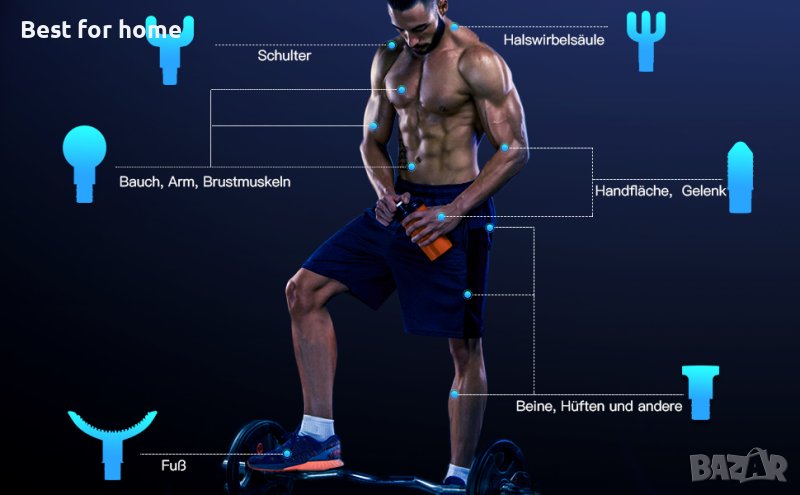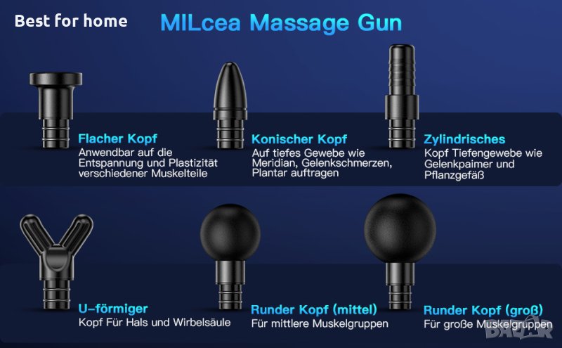 - Пакетът включва: 1 x масажен пистолет, 6 x различни масажни глави, 1 x ръководство за употреба (английски език не е гарантиран).