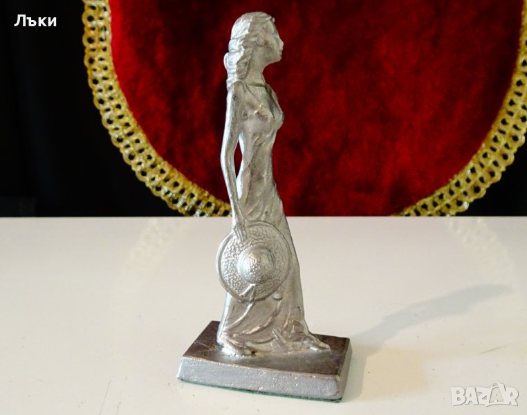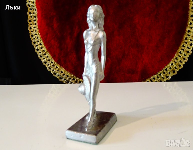 Немска статуетка,скулптура,фигура Млада Дама с шапка в ръка,майсторска ръчна изработка от 95% калай и 5% сребро.Височина 10.5 см.,размер на основата 4.7 х 3 см.Тегло 200 гр.