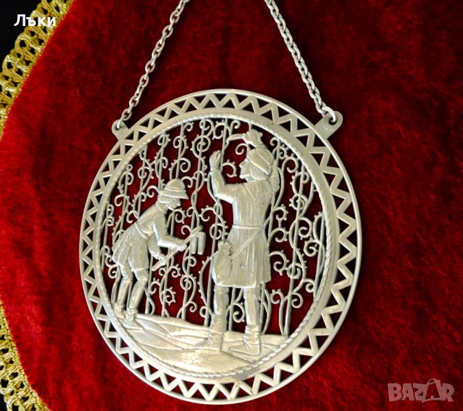 Немски плакет,пано,медал,картина,майсторска ръчна изработка от 95% калай и 5% сребро.Представя труда на Лозарите и Градинарите.Има окачалка за стена.Диаметър 14 см.,височина 20 см.,тегло 105 гр.