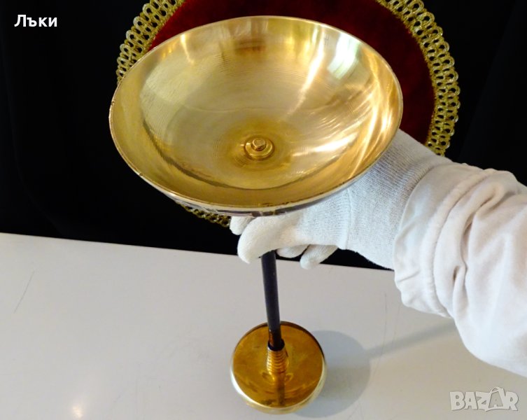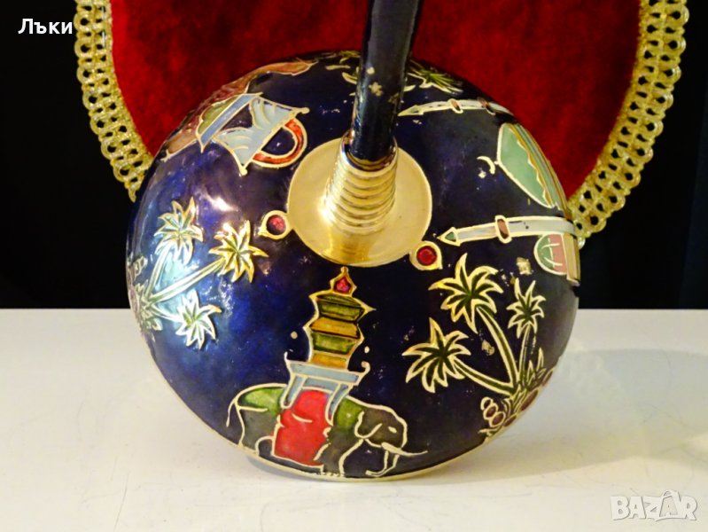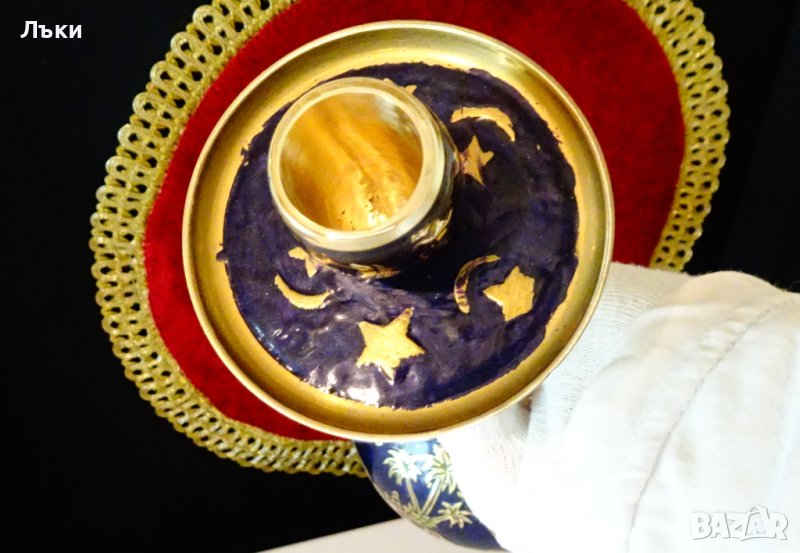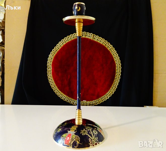 пресъздадена със сложна техника от цветни клетъчни емайли.Определено свещника е