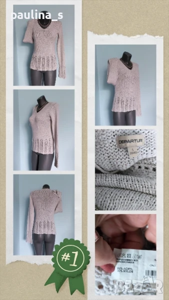 4️⃣. Колаж / S / 2XL - "DEPARTURE". Цената е крайна 29,99лв / 15 евро. Като нов. Преждата е от акрил и вискозна коприна, плетката - като дантела. Изключително красива дреха с фуния ръкави. Трикото е рехаво и дава еластичност, покрива няколко размера. Пада тежко и стои превъзходно. Като нов.