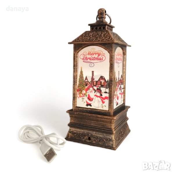 Светещ коледен фенер с приказен снежен принт от четирите си страни с Дядо Коледа и Снежко. Може да се закачи и да се превърне в приказна висяща коледна украса. Вътре във фенерът има лед свещичка, която свети в много мека светлина. Фенерът може да работи с USB кабел, или само на батерии (3 броя ААА батерии, не са включени в комплекта).