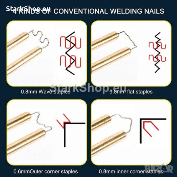 Пистолет за заваряване на пластмаса е добър начин за ремонт на повечето модерни продукти, изработени от пластмаса. Подходящ за ремонт и подсилване на пластмасови части на всички превозни средства, като брони, табла, фасунги, пластмасови пръстени и ежедневни пластмасови аксесоари.