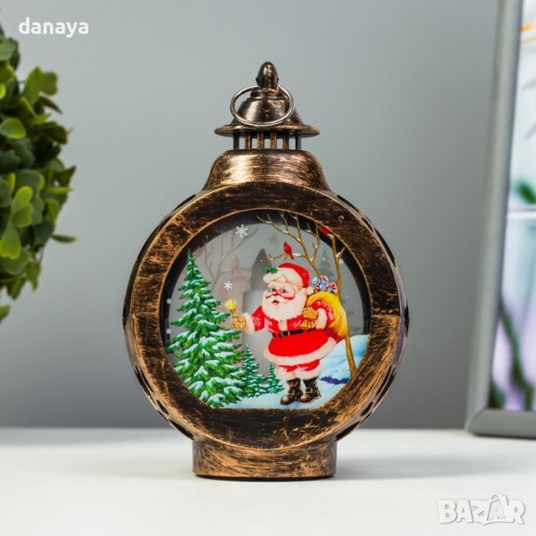 Кръгъл коледен фенер с приказен снежен принт от двете си страни с Дядо Коледа, Снежко или елени. Може да се закачи и да се превърне в приказна висяща коледна украса. Вътре във фенерът има лед свещичка, която свети в много мека светлина.