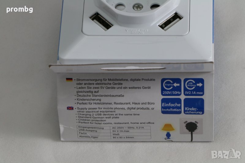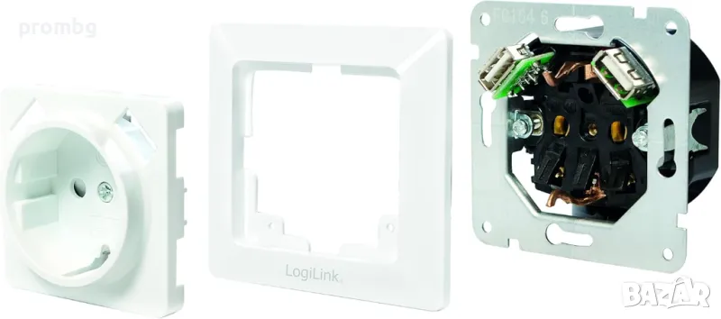контакт с 2 USB порта, внос от Германия Logilink. Контактът позволява едновременно включване на 1 уред 220 V и 2 USB устройства. Мощност: AC 250V, 50 Hz, 0.21A; USB изход: 5 V, 2.1 A макс. Конзола - стандартен размер, детска защита. Размери: 80 x 80 x 54 mm. Дълбочина 45 mm. Тегло 120 гр.