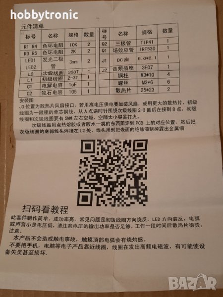 Създава се високо напрежение, което може да се модулира от звуков сигнал, и да се чува. Необходимо е внимание при сглобяването и особено при работата с устройството.