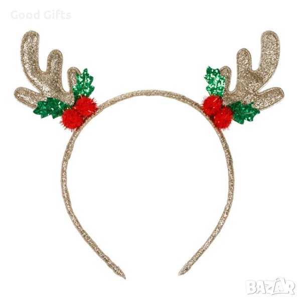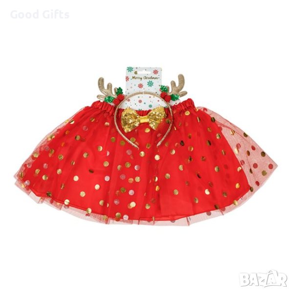 Туту пола с червен тюл със златни точки и диадема за коса със златни еленски рога (5x8 см) и червени помпони