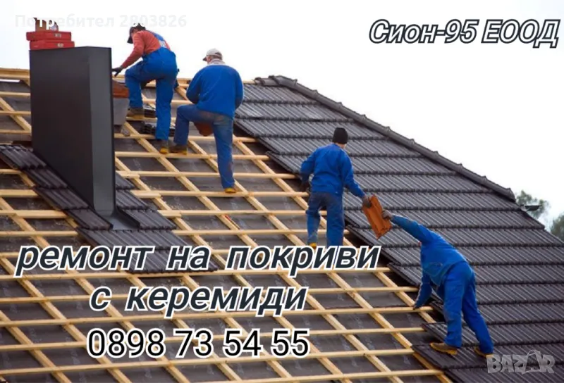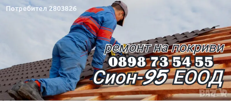 ➡️➡️➡️Сион-95 ЕООД ПРЕДЛАГА широка гама от ПОКРИВНИ РЕМОНТИ ✅️ с специализирани в сверата на стройтелството майстори🏚 👷‍♂️🏠30%ОТСТЪПКА за нови клиенти🔺️КАЧЕСТВО✅️ ДОГОВОР📃 ГАРАНЦИЯ 🔟.гдобри и достъпни цени💶 за всеки, вземи твоята оферта на момента реши проблема завинаги.➡️Частични и цялостни ремонти 👍🔨Хидроизолация, улуци, обшивки,Битумна керемида Ламарина всякакъв вид.Всичко е възможно с нас"Тел.0898735455