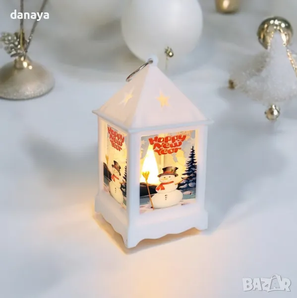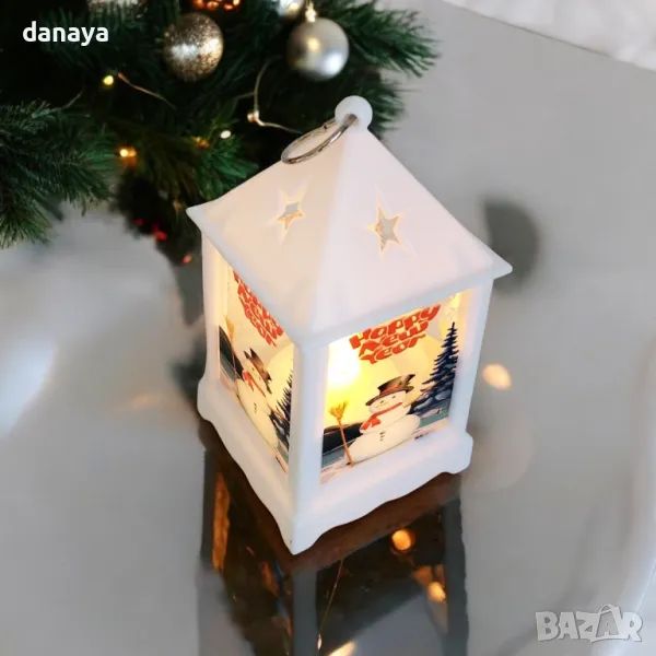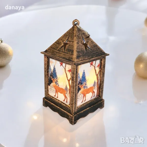 Малък ретро коледен фенер с приказен снежен принт от четирите си страни. Може да се закачи и да се превърне в приказна висяща коледна украса. Вътре във фенерът има лед свещичка, която свети в много мека жълта светлина. Работи с 3 LR44 батерии, които са включени в комплекта. Фенерите се предлагат без кутия.