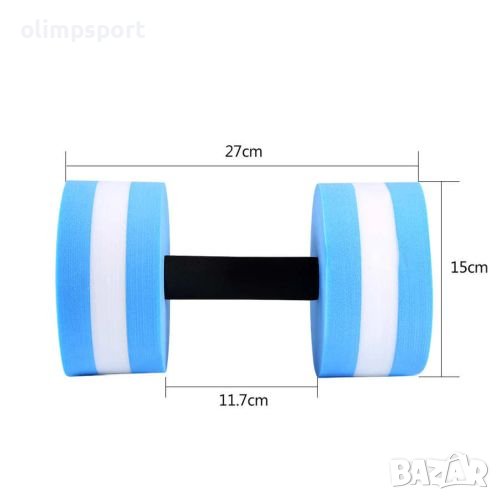 Дъмбел (гиричка) за водна аеробика, 27 х Ф15 см. Увеличава съпротивлението на движенията във водата, което прави упражненията много ефикасни за укрепване на мускулите на ръцете и горната част на тялото. Подходяща за тренировки по издръжливост във вода. Удобен захват. Размери - 27 х Ф15 см. Тегло - 120 г. Дължина отсег за хващане - 11 см. Материал дискове - EVA. Материал дръжка - полипропилен, хидриран нитрилов каучук.