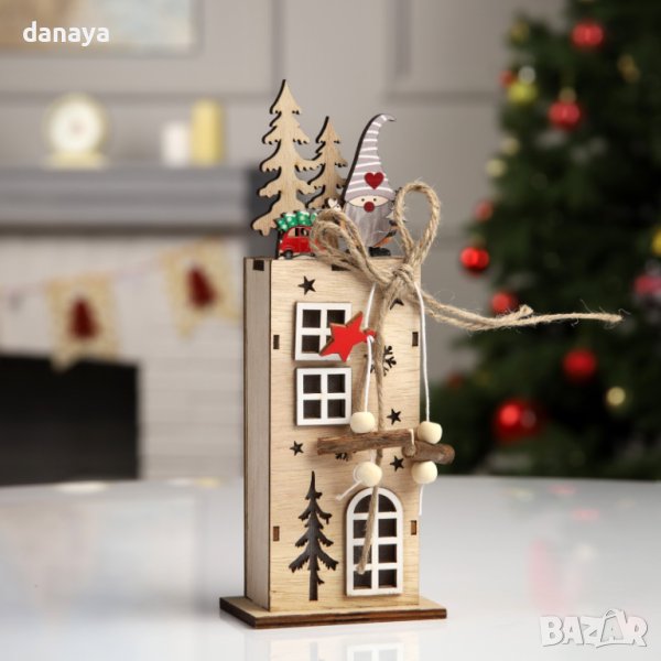 Дървена светеща къщичка с лед светлини “Фабрика за подаръци”. Светеща дървена коледна играчка, украшение и допълнение към украсата за Коледа. Ще стои чудесно върху бюро, скрин или където решиш 🙂