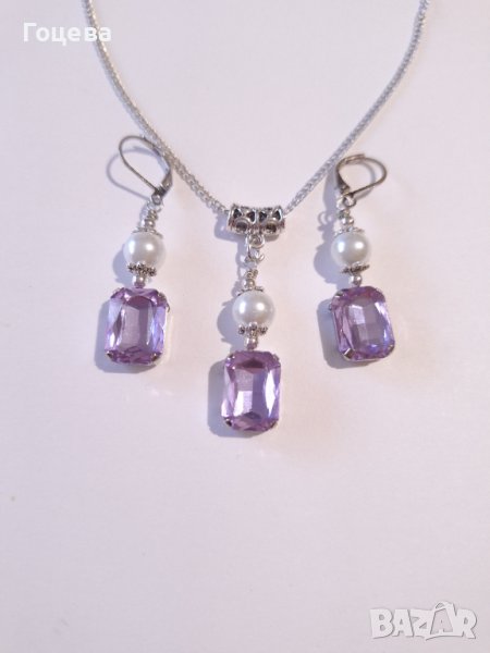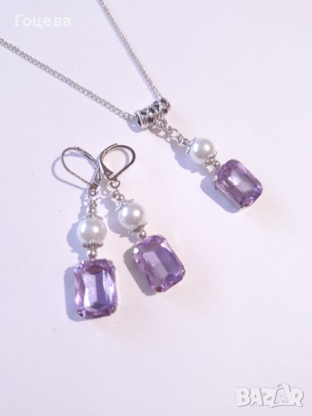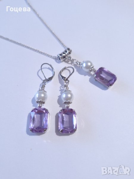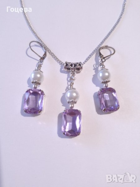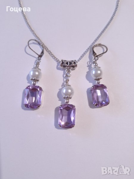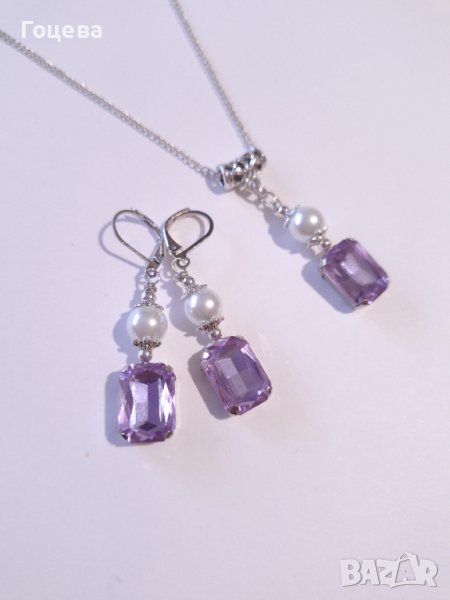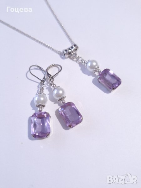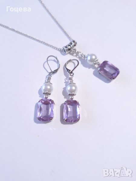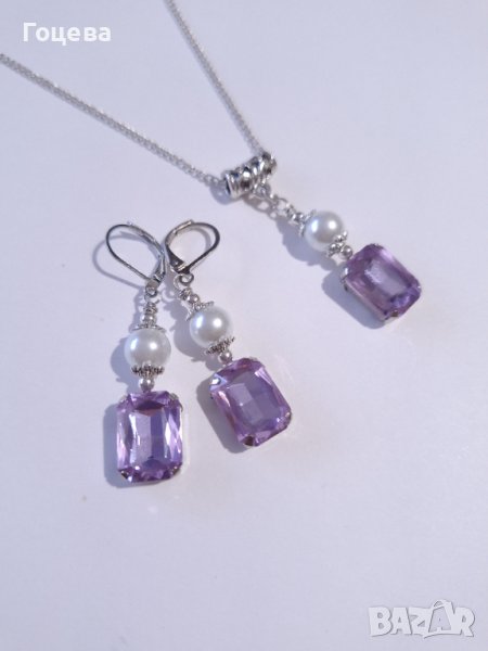 Красив комплект бижута обици и колие с лавандулово лилави кристали и кристални перли