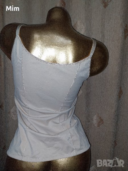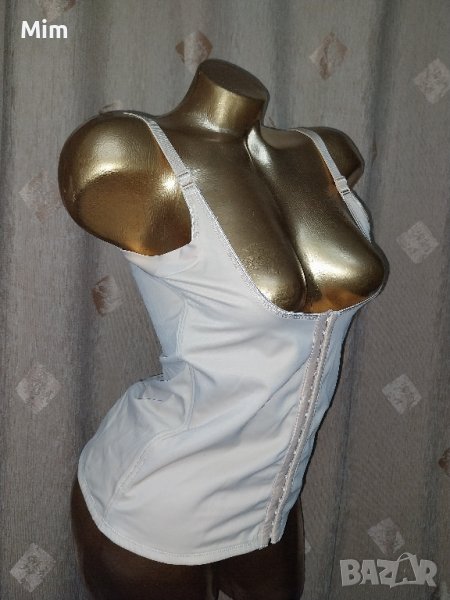 моделиращ корсет / потник/ от еластичен плътен микрофибър в предната част с подплата, закопчаването е отпред двуредно, закопчаване по цялата дължина с телени закопчалки с отворен бюст, регулируеми презрамки ,подгръдна 42 до 60 см едностранно, дължина 55см.с два отвесни банели отпред.в долната вътрешна част и със силиконова лента против преплъзване. Няма забележки