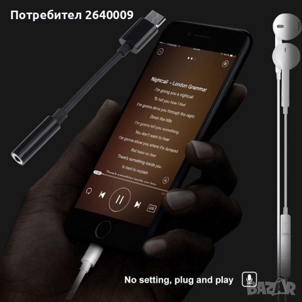 Кабел type C male to audio jack & typeC female. Различни цветове /виж снимките/.Имам и без раздвояване /само USB-C to AUX/.