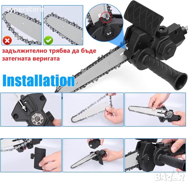 Приставка за електрическа бормашина - резачка. Изключително практична джаджа, която ще превърне вашата бормашина в ръчен моторен трион! Конверторът се монтира към гнездото на винтоверта като класическа бормашина. Удобната дръжка с регулируема позиция осигурява голямо удобство при работа. Специален предпазител над веригата повишава безопасността по време на употреба.