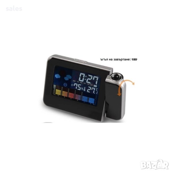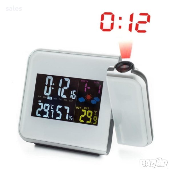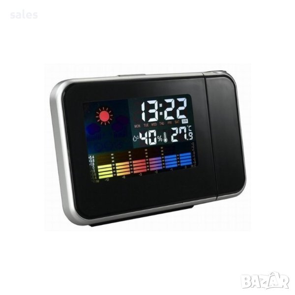 Настолен часовник с цветен LCD дисплей, проектор и функции: термометър (Целзий, Фаренхайт), влагомер, аларма с функция Snooze, иконка за прогноза за времето.