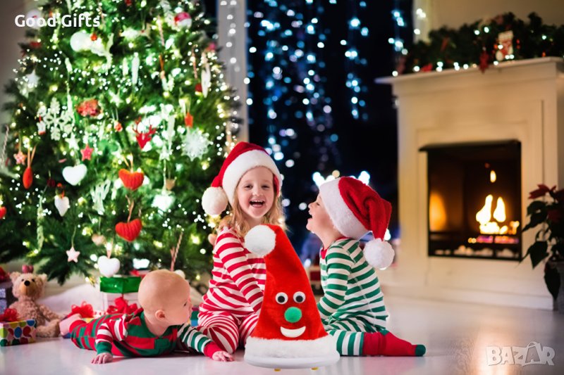 Коледна интерактивна играчка червена шапка на Дядо Коледа с движение и коледна музика. Има бутон за включване/изключване. Работи с 3 AA батерии (не са включени).