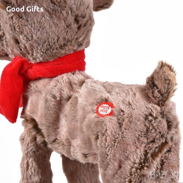 Коледна интерактивна играчка елен с червен нос и шал, който ходи и пее. Има бутон за включване/изключване. Работи с 3 AA батерии (не са включени).