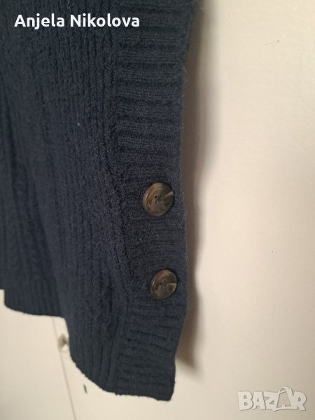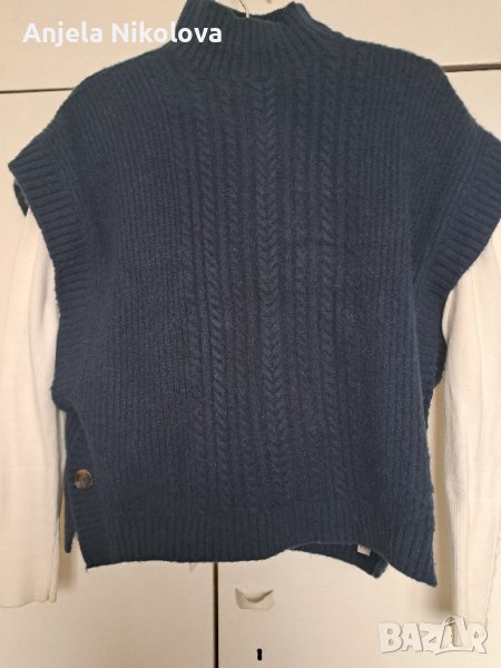 Пуловер без ръкави, с паднало рамо, полу поло. От двете страни има големи декоративни копчета. Стои прекрасно с риза отдолу върху панталон. Със съдържание на мерино (изрязала съм етикета и не си спомням проценти). Цветът е петролено тъмносиньо. Купуван е от Франция, обличан е 2 пъти.
