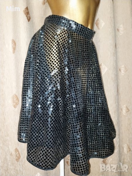 Черна прозрачна пола със залепени лъскави кръгове с отблясък. в талията с колан надолу се разширява. Талия 35 до 42 см едностранно, дължина 55 см .Нова без хартиен носител.
