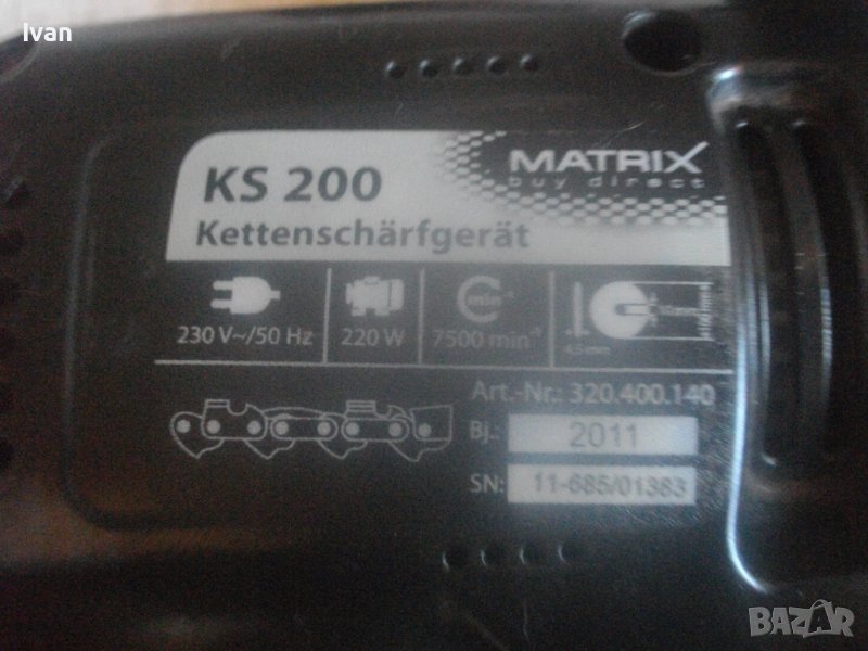 ОПИСАНИЕ на черна почти нова немска ел.машина за заточване на вериги - 220 вата - MATRIX - цена 229 лв. ОПИСАНИЕ на почти нова немска машина 220 вата МАТРИКС - 199 лв. Почти нова, много малко употребявана хипер мощна 220 ватова ел. машина за заточване на вериги, немско произовдство модел на МАТРИКС. Марка и модел на машината - MATRIX KS200.