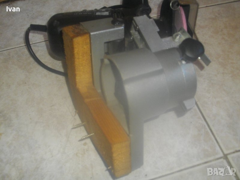 Машината е с поставена допълнително масивна дъска под долната основа за стабилен и здрав стоеж, с поставени 2 видии в дъската за захват на машината към работна маса.