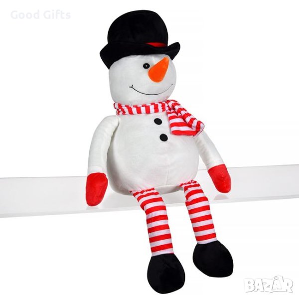 Коледна плюшена играчка, снежен човек с черна шапка, шал на червени райета и дълги раирани крака.