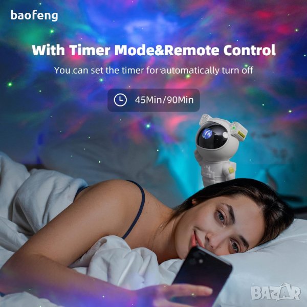 Прожекционната лампа за звездно небе на астронавта с дистанционно управление може да контролира включването/изключването на режимите на мъглявина и звездна светлина. Можете да регулирате яркостта, да промените режима на светлина и може да показва различни ефекти на мъглявина. Можете също така да регулирате скоростта и яркостта на мъглявината. Два режима на време: около 40 минути и около 90 минути, автоматично изключване, можете лесно да получите достъп до тези настройки, без да ставате.