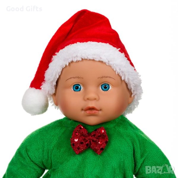 Коледна кукла бебе, облечена като елф, с меко тяло.