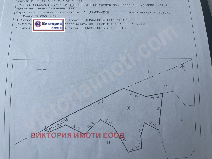 Имота представлява парцел с големина 2707 кв.м. и се намира в местност 'Джабиловец'. Трайно предназначение на територията е земеделска, нива /седма категория/.