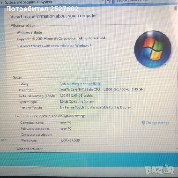Процесор:Intel Core 2 Solo SU3500 1 x 1.4 GHz, Penryn