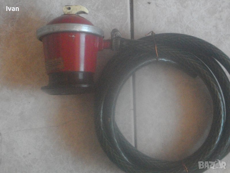 ОПИСАНИЕ на ретро български от НРБ газов редуцир вентил ниско налягане - регулатор налягане за газ пропан-бутан, с маркуч - 129 лв. Старо соц качество и производство на НРБ - 1988 г. Маркуч дължина 2 м, без пропуквания, много запазен. Вентил червен - почти нов, отлино техническо8работно състояние. Технически характеристики по етикет на вентила: