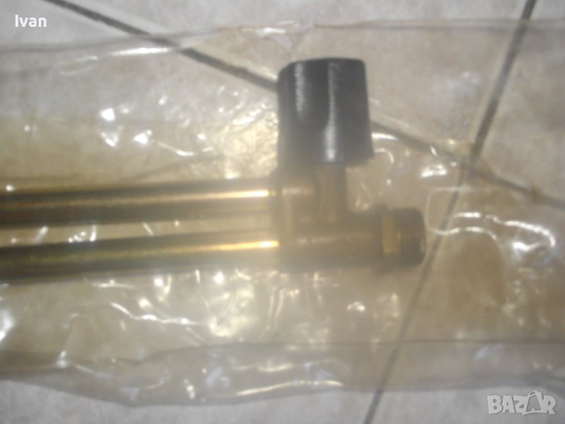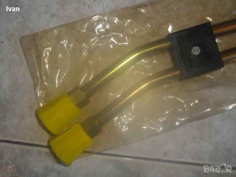 ОПИСАНИЕ на нова газова горелка 57 см с 2 тръби и 2 дюзи специализирана -99 лв. Старо качество Западна Германия. Две маркировки - WEST GERMANY. Горелката е съвсем нова, неизползвана и неупотребявана. В оригиналния си дебел найлонов плик. Дължина 57 см, 2 тръби раменни оловно-цинкови, скачени на тях 2 специализирани различни конкатни дюзи /едната е с съвсем малък издъжен прорез за пламъка и маркировка H 1 5VY 25055, другата дюза е с широк издължен прорез за пламъка. Отзад горелката е с оригинален немски бронзов спирателен кран с маркировки 35 MPa.