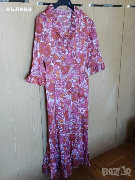 Елегантна дълга рокля, почти нова, размер М,с волани, ръкав 3/4, сезон пролет,лято,есен, гръдна обиколка 96см, талия 80см.
