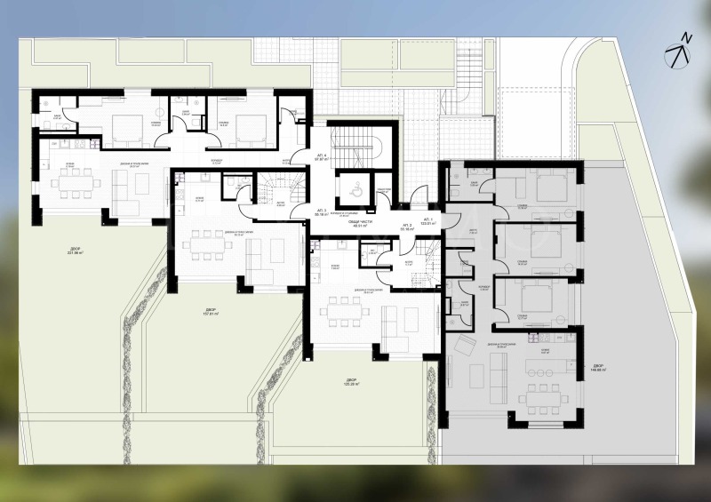 Жилището е с 146.68 кв.м самостоятелно дворно пространство, което се доближава максимално до усещането за живот в къща. Перфектно решение за семейства и за тези, които обичат да бъдат близо до природата, без да се отказват от удобствата на градския живот.