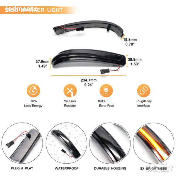 - Комплектът включва 2 броя мигачи огледала (ляв и десен)