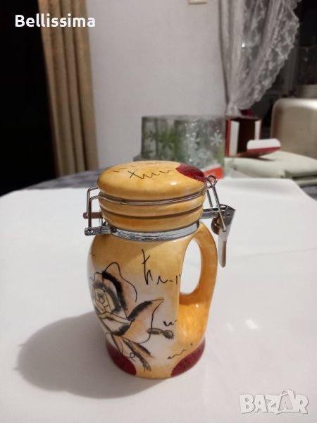 Красива и интересна керамична захарничка, с плътно затварящо се капаче. Подходяща за подарък